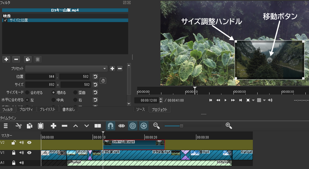 (フィルターの追加) → 「映像」タブの「サイズと位置」をクリック