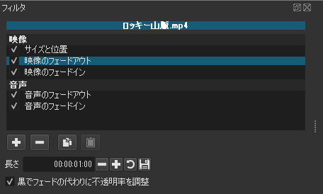 クリップに1秒間のフェードイン・フェードアウトを追加します。(それぞれ「黒でフェードの代わりに不透明率で調整」をonに)