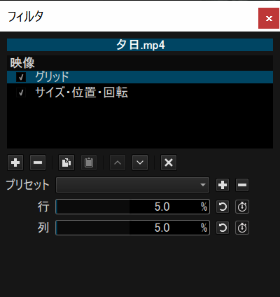 なお、フィルターだけでは、再生している動画サイズを徐々に大きくするなど動的フィルターの値を変更することはできません。この場合には、キーフレームを利用します。