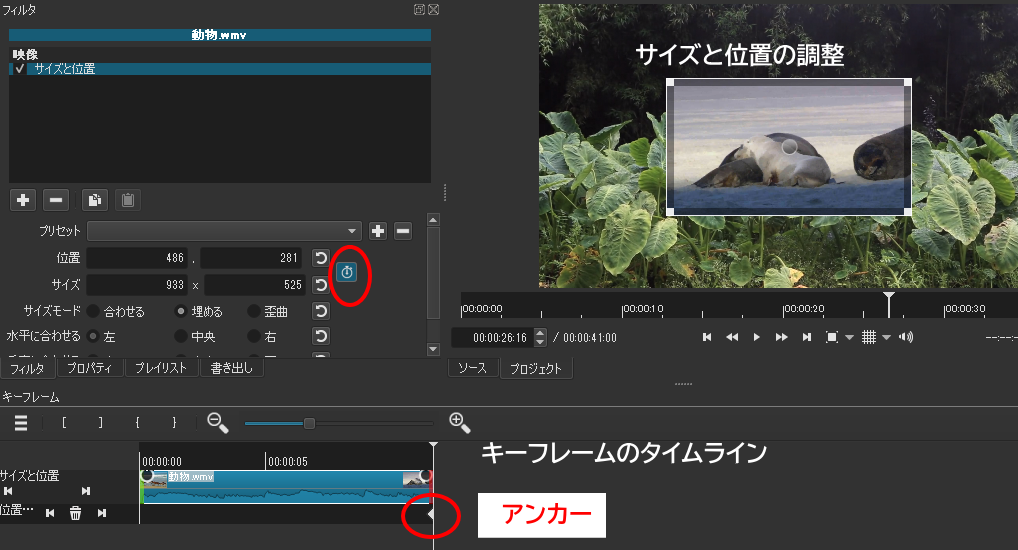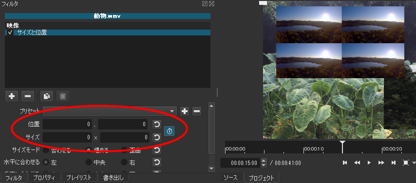 (フィルターを追加) → 映像タブの「サイズと位置」 → プレーヤーのハンドルと移動ボタンで画面の中心、約1/4の大きさに設定