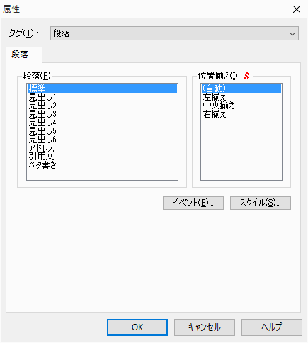 - 「標準」「見出し1」から「見出し6」、「アドレス」、「引用文」、「ベタ書き」の10種類あります。「アドレス」、「ベタ書き」は、通常、使用しません。