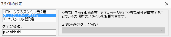 プルダウンメニュに表示されるクラスは、フォーカス要素(ここではp要素)に設定可能なクラスのみです。