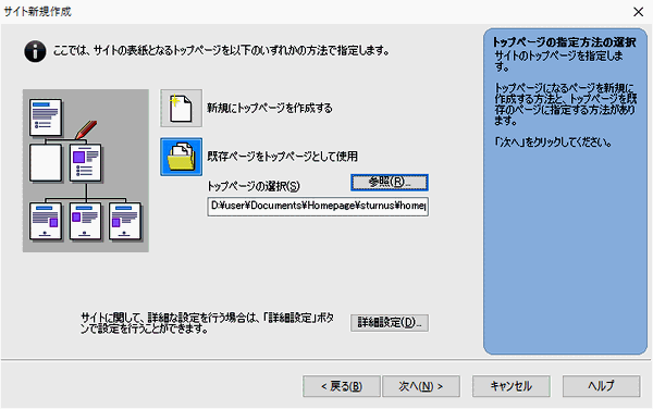 既存ページをトップページとして利用をクリック → トップページを指定 [次へ]