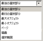 選択されているオブジェクトを整列するための基準とするアンカーで、「選択された順番」・「オブジェクトのサイズ」・「ページ全体」・「描画全体」・「描画」があります。