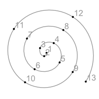 螺旋形を描き、ノード番号を表示しました。(通常描かれた順に番号が付きます)元のパスは削除されます。パスの編集で、ノードの順番が重要なファクターになる場合があります。