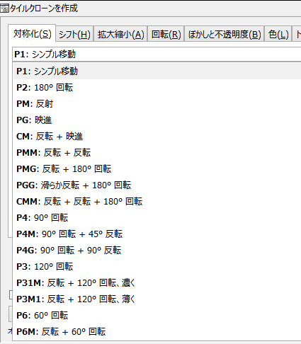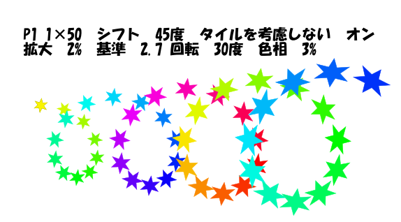 「回転」タブ 列ごとに12度、「シフト」タブ 列ごとに「タイルを考慮しない」をon、「対称化」タブで、1行30列のP1を設定しました。