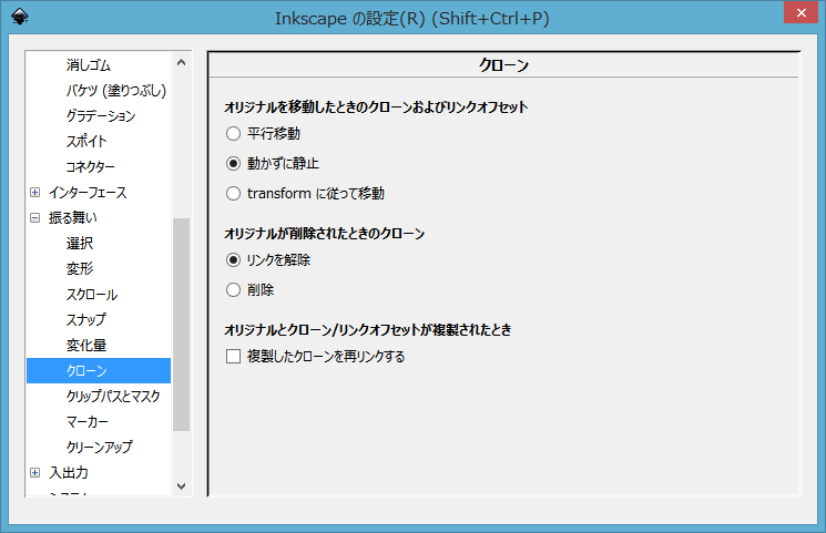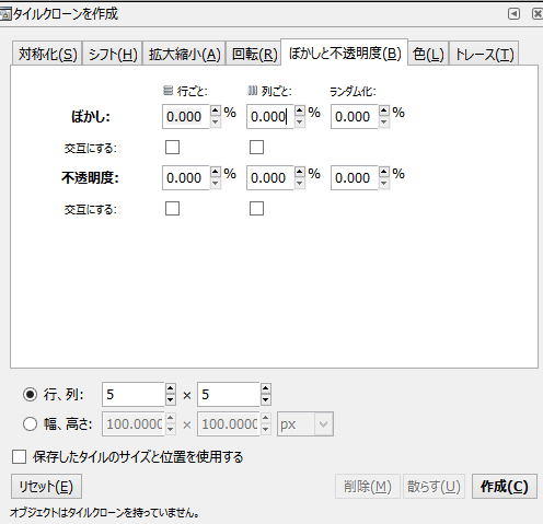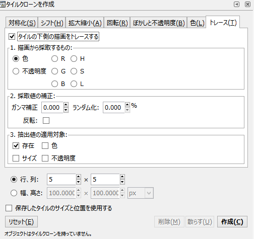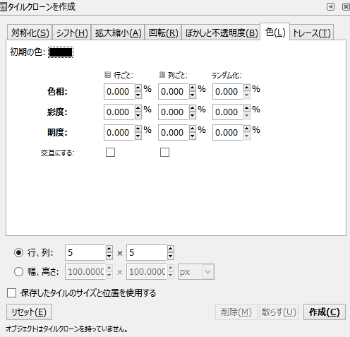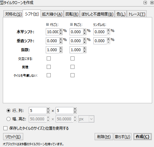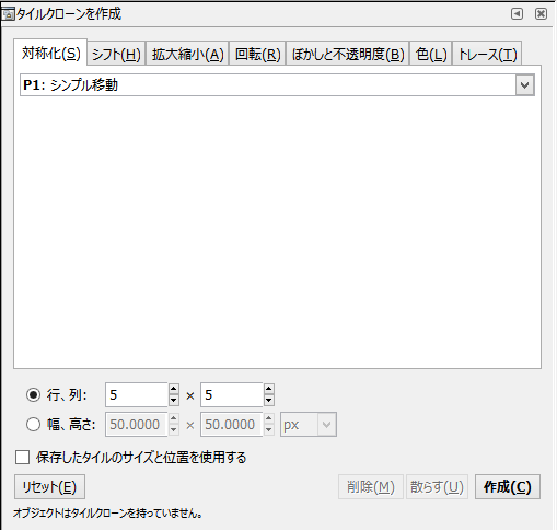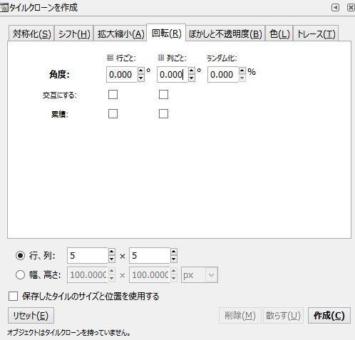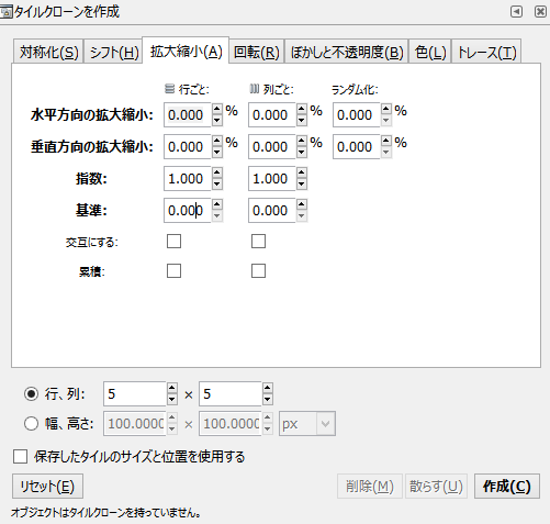 タイルクローンは、ダイアログで指定されたすべての設定値を用いて作成されます。この設定値は、Inkscapeに保存されますので、新しいタイルを設定する場合には、最初にリセットで初期値に戻してください。