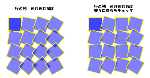 タイルの間に入れるスペースを%(マイナスも可)で指定します。(バウンディングボックスが基準です) ランダム化を指定することもできます。