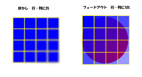 タイルのぼかしと不透明度(フェードアウト)が規則的に変化します。