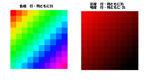 タイルの色を規則的にHSL色空間(色相・彩度・明度)で変化させます。