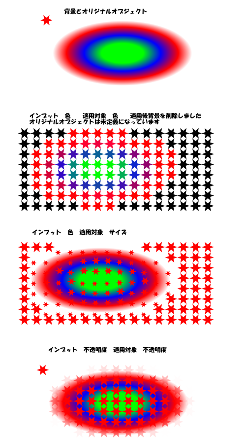 クローンを作成する領域にあるオブジェクトの色や不透明度を元に、クローンの色やサイズ・不透明度を変えることができます。