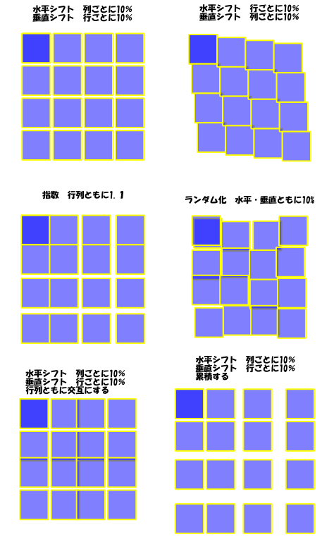 タイルの位置を指数関数で変化させます。 位置は(1+シフト)**指数です。