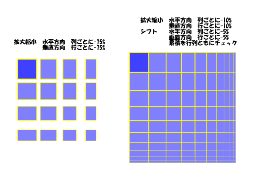 右 水平・垂直方向に、-15%(縮小)を設定した例です。隣り合ったタイルの距離は一定です。