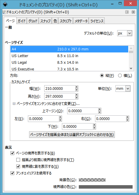 描画に使用するドキュメントのサイズや表示するガイド・グリッド線、スナップ方法などについて指定します。