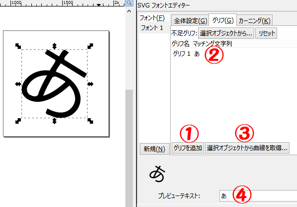 → ①グリフ1のマッチング文字列をクリック → ②