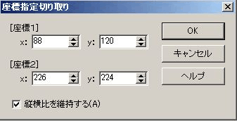 「縦横比を一定」と同様に、座標を指定します。座標2には、切り抜くサイズを指定します。(サイズ指定時には、「縦横比を維持する」のチェックは外しておいてください。